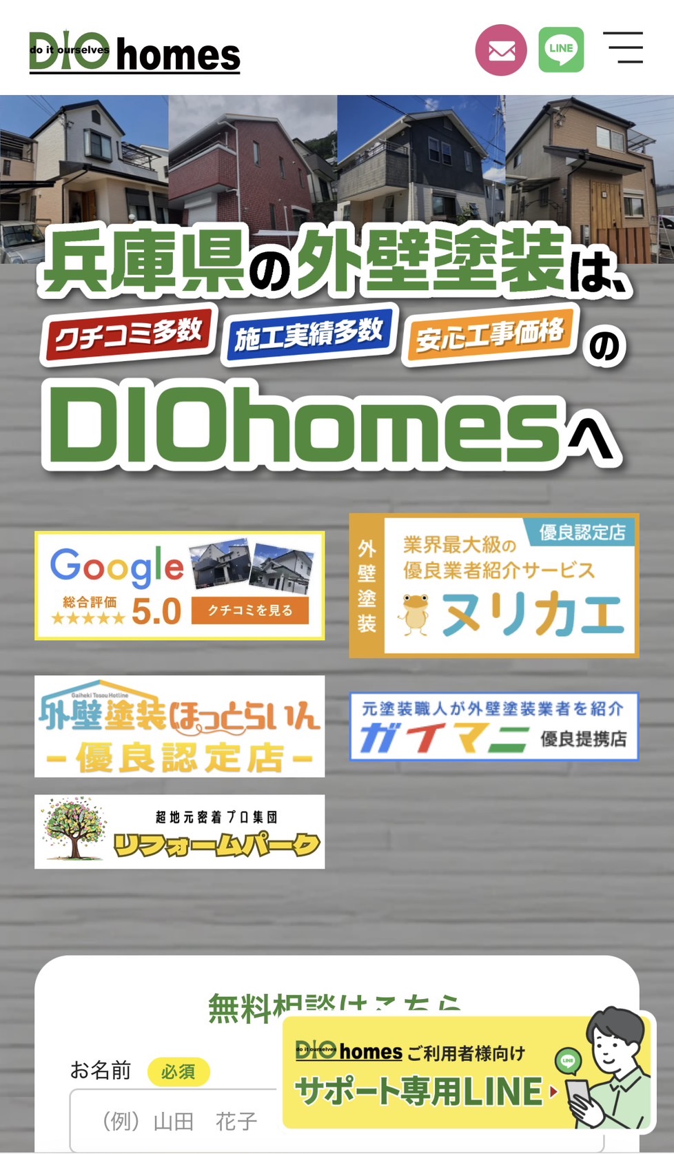 DIOhomesは、外壁塗装・屋根塗装・リフォーム全般を手掛ける総合施工会社です。施工前には現地調査を行い、建物の状態や劣化箇所を詳しくチェック。最適な塗料と施工プランを提案し、納得した上で工事を進められます。