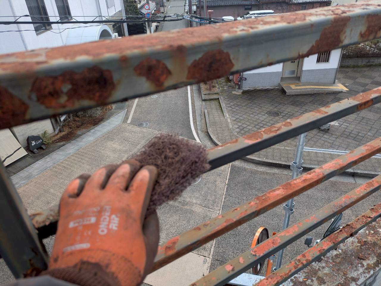 鉄部表面の錆や汚れ、古い塗膜などを除去する作業です。