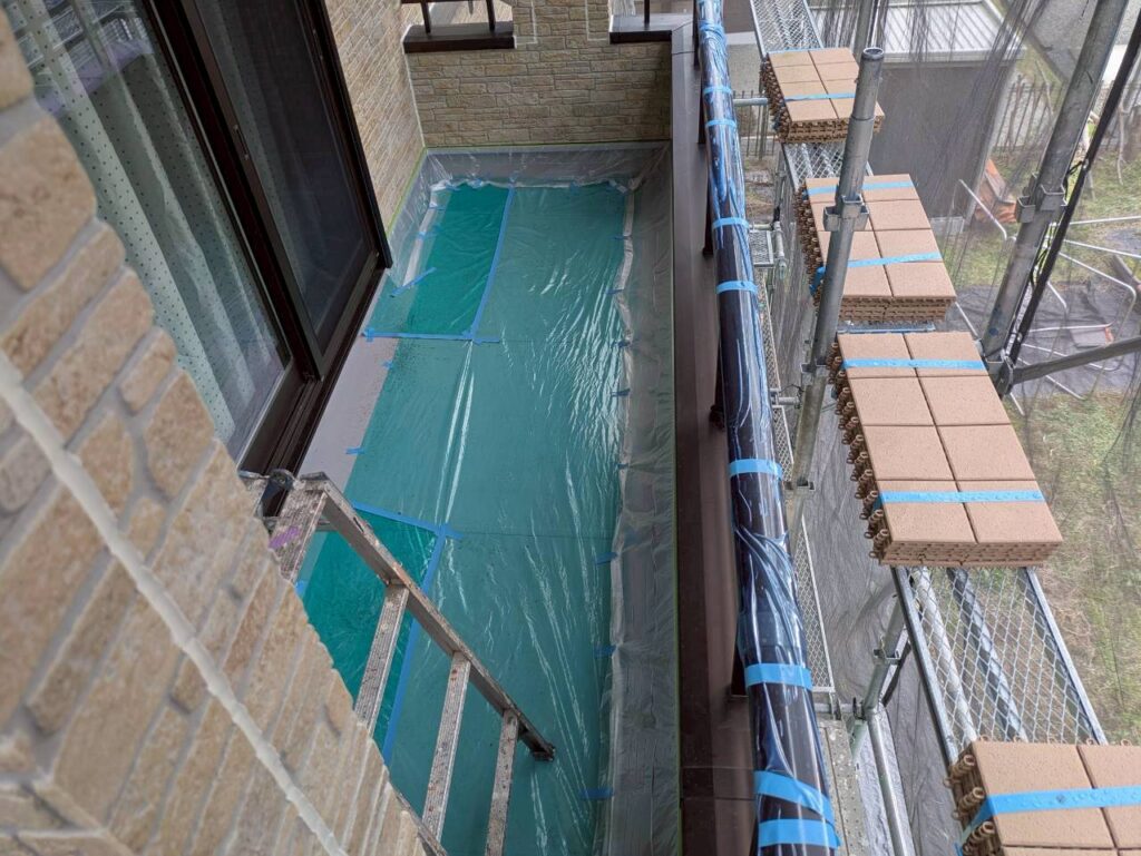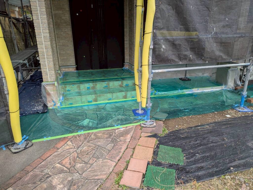 特に外壁塗装では、塗装しない部分や周囲の環境を守るためにビニールシートやマスキングテープ、ブルーシートなどを使って丁寧にカバーすることが重要です。