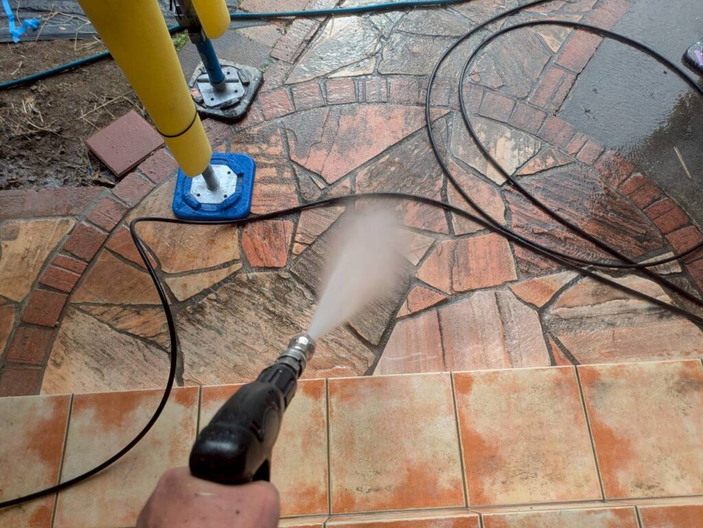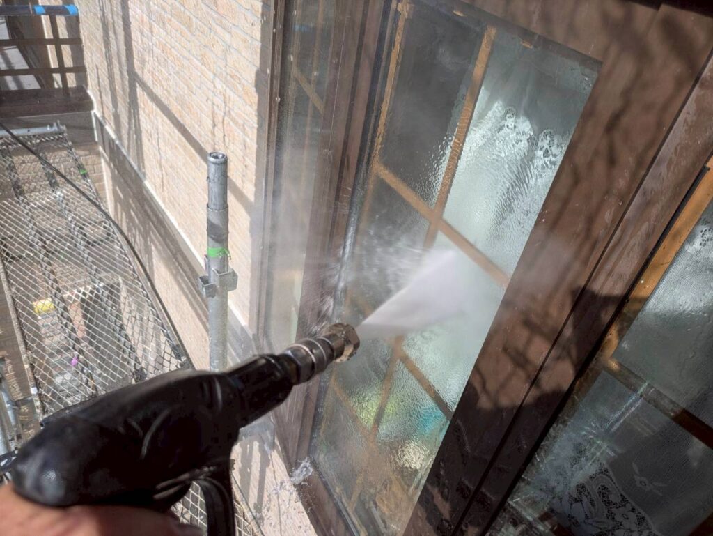 外壁・屋根はもちろん、軒天、窓際、室外機など隅々まで洗浄します🚿