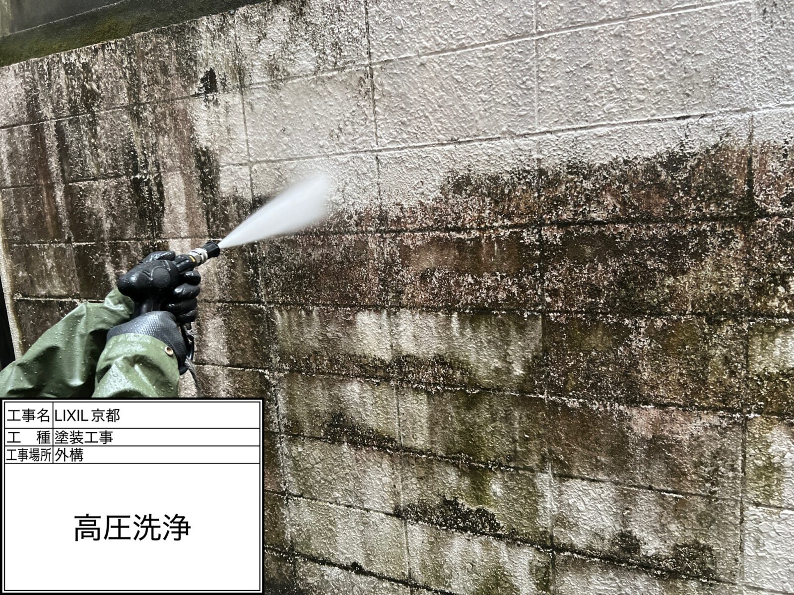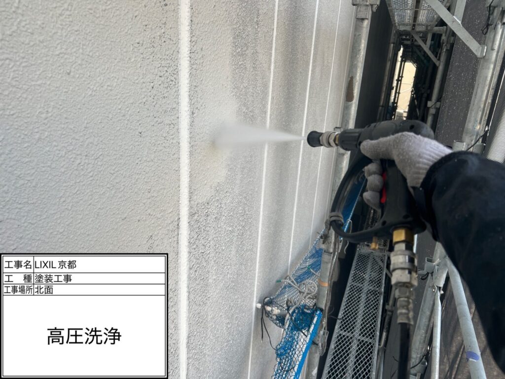 高圧洗浄は必ず必要です!!外壁に付着した汚れ(砂、ホコリ、雨筋汚れ)や傷んだ旧塗膜(はがれた塗膜、チョーキング)などコケ、藻、カビなどを洗い流します。