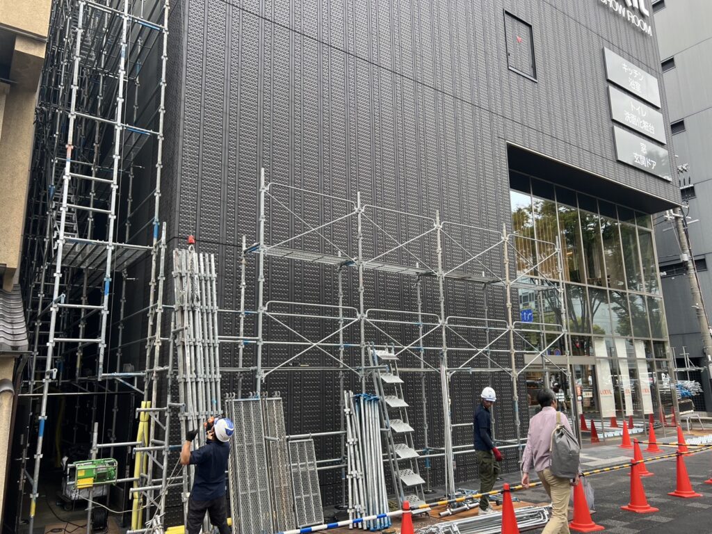 足場とは、主に建設現場の建物の外壁面に沿って設置される道路のようなものです地上では作業できない高い部分をこの足場をつかって作業を行います!!